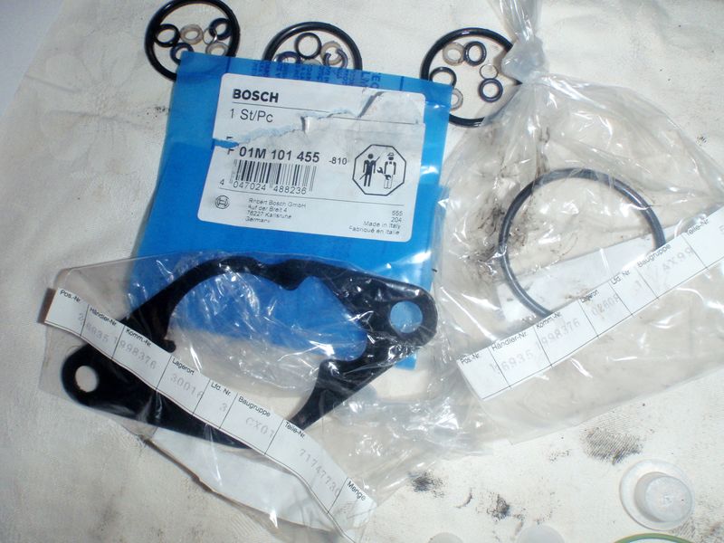 Ich wusste nun, dass die Kiste keine herkoemmliche Einspritzpumpe hat, sondern eine Hochdruckpumpe (Bosch 0445010080) und diese reparabel ist, wenn man den passenden Dichtsatz bekommt. Also haben wir uns den Freitag frei genommen, um die noetigen Teile zu besorgen. Beim Boschdienst wollte man erst eine neue besorgen (860,-), den Dichtsatz kannte man nicht, bei der Leise-Vertretung ( http://www.leise.de/ ) haette man uns eine neue Pumpe verkauft (710,-), bei FIAT ( http://www.pav.fiatpartner.de/ ) war man seeeehr bemueht. Natuerlich erst die Austauschpumpe, irgendwas um die 1000,-. Als ich dann wieder von dem Dichtsatz erzaehlte und das ich es selbst wechseln wollte, war ein Mechaniker eher skeptisch, der andere aber entsannte sich an ein paar Kontakte und nach etwas rumtelefonieren fand er sogar bei einem weiteren oertlichen Teilehaendler Knoll ( http://www.knoll-gruppe.de/xis…andel-plauen_id_4201_.htm ) den passenden Reparatursatz von Bosch F01M101455-810 fuer 20,-. Bei Fiat bestellte ich die Nockenwellendichtungen fuer die HD-Pumpe (55186955 ; 5,-) und die Unterdruckpumpe (71747730 ; 15,-), die man ja leider mit abbauen muss und beim Knoll eben den Satz Dichtungen.