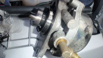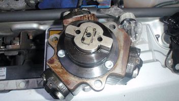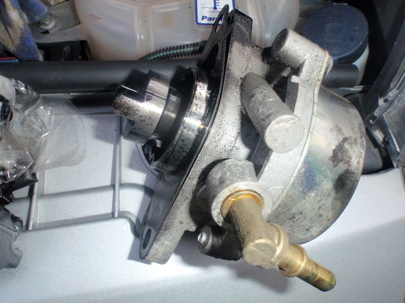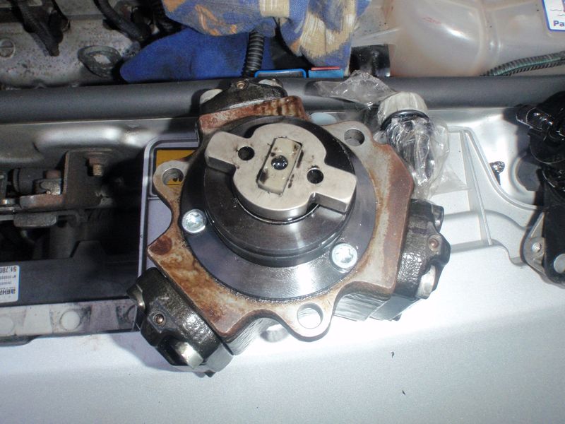 Den Rest des Tages verbrachte ich damit die Pumpe auszubauen und zu zerlegen. Die Abdeckung war das erste Hindernis. Beide Ansaugstutzen abziehen und dann nach oben vorne herausnehmen. Einer der Gummis wollte nicht loslassen. Mit Silikonspray ginge es dann. Dann den Akku ausbauen, damit mehr Platz ist, Die Unterdruckdose abbauen, da die eine Schraube der Hochdruckpumpe verdeckt wird und dann diese. Am schwierigsten war das Entfernen der Kraftstoffzulaufleitung. Bis ich das raus hatte, wie das abgeht. Man muss den weissen Ring ganz nach unten ziehen. Beim Abnehmen der HD-Pumpe und der Unterdruckpumpe darauf achten, dass die Mitnehmer nicht herunterfallen. An der HDpumpe loeste ich schon mal leicht die Schrauben von den Deckeln.