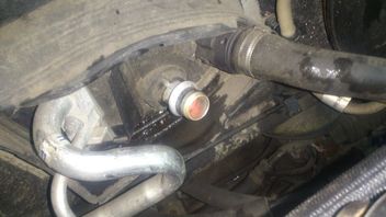 Jetzt die 2 langen Torxschrauben lösen, die das EGR am Motorblock festhalten. Da das AGR mit Kühler ist, muss ich auch die Kühlung abklemmen. Damit man nicht die Kühlflüssigkeit komplett ablassen muss, kann man die Heizung im Auto auf kalt stellen, dadurch wird das Ventil geschlossen. Dann den rueckgehenden Heizungsschlauch quetschen und den Schlauch zum AGR vom Thermostat abziehen und schnell mit z.B. 'ner kleinen Zip-Tüte und einem Haargummi das auslaufende Rohr vom Thermostat verschließen.