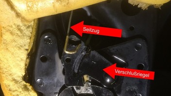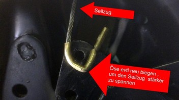 5. Bei uns lag das Problem anders. Der Seilzug betätigt an der linken Seite einen Sperriegel, der über ein Verbindungdrohr mit der rechten Seite verbunden ist.