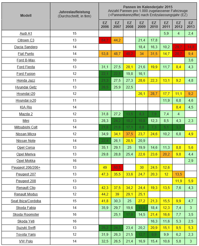 Audi A1, Ford Fusion, Hyundai ix20, Mazda 2, Mini, Mitsubishi Colt, Toyota Yaris und VW Polo überzeugen mit niedrigen Pannenwerten in allen Altersklassen. Die jüngeren Modelle des Dacia Sandero sind wegen Batterieproblemen abgestürzt. Während das Vorgängermodell Hyundai Getz sehr pannensicher war, erreicht das Nachfolgemodell i20 nur Mittelmaß. Über alle Jahre am schlechtesten schneidet der Fiat Punto ab.