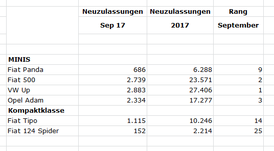 Leichter Zuwachs beim Panda und 500er! Der Tipo nach 2 schwachen Monaten wieder auf Kurs!