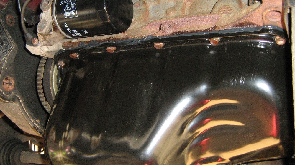 Neue Wanne (Fa. Augustin) mit Dichtsilikon belegen (offiz. ca. 2/3 der Tube ausdrücken). Dann Wanne ran und alle Schrauben wieder festziehen. Den Rest in umgekehrter Reihenfolge wieder zusammenbauen. Krümmer- und Ringdichtung zum Mittelrohr, sowie Ölfilter gleich mit austauschen. Ich hab's über Nacht durchtrocknen lassen - Alles dicht!!! Nicht vergessen: Neues Öl rein... und ab auf die Piste