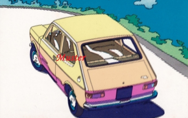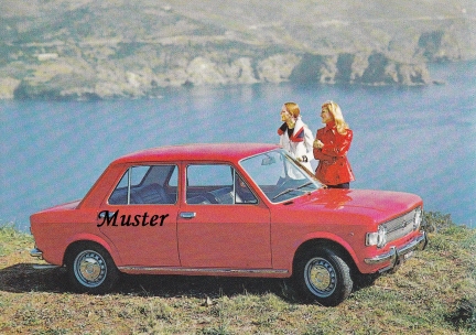 das auto ist übrigens ein 127 mit kofferraumdeckel, also ohne heckklappe noch. genau so einen, sogar in der selben farbe habe ich auch gehabt, es war mein erstes neues auto. (das lila unten war natürlich nicht) 903ccm, 47 ps.